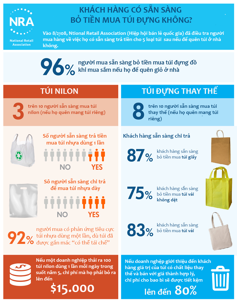 Với xu hướng Marketing 4.0 lấy khách hàng làm trung tâm, mọi thay đổi và cải tiến của sản phẩm đều dựa trên nhu cầu của khách hàng. Theo khảo sát của National Retail Association, phản ứng của khách hàng khi được hỏi có sẵn sàng bỏ tiền ra mua túi nilon hay túi giấy là hoàn toàn trái ngược nhau. Có đến 87% khách hàng sẵn sàng bỏ tiền cho túi giấy trong khi đến 92% người mua phản ứng tiêu cực với túi nilon.
